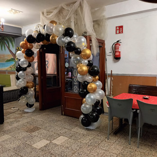 En la otra parte de la puerta de entrada al bar montamos un arco con globos dorados, negros, blancos y con purpurina para seguir dándole un toque festivo a la zona donde se encontraban los billares, futbolines y diana.