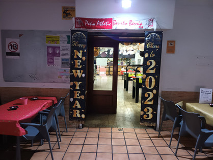 Después nos dirigimos al pasillo que llevaba al interior del bar y decoramos la barandilla con tonos dorados y le pusimos algunos lazos rojos para seguir con el toque navideño. Las mesas que hubiera también pusimos manteles y además en la puerta de entrada pusimos 2 bandas dando la bienvenida al nuevo año 2023